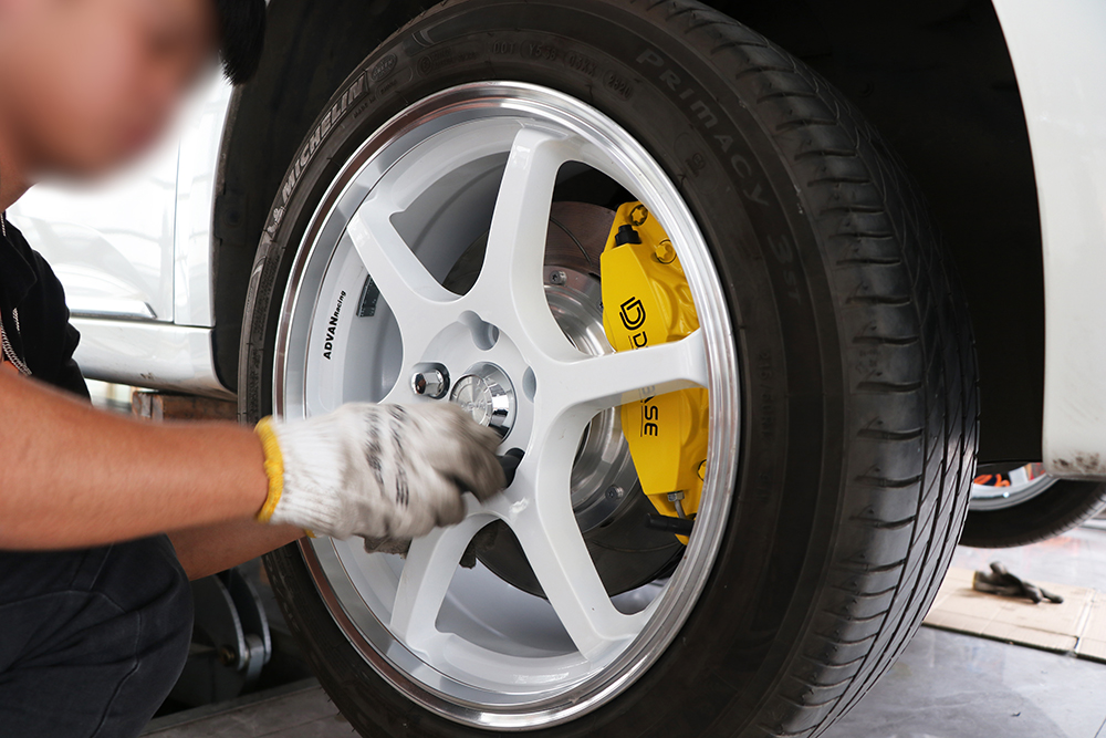 名爵6剎車升級(jí)案例,17寸改裝輪轂,選用的是DICASE大四活塞剎車卡鉗,搭配hp1000剎車皮,DICASE全新升級(jí)的防爆鋼喉,330劃線剎車盤。