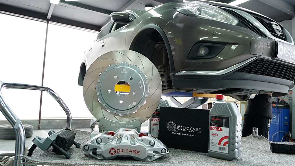 日產(chǎn)樓蘭原車輪轂18寸,升級迪卡司D61搭配355高碳盤,搭配HP2000高性能剎車,提升顏值,剎車效果更加的靈敏!