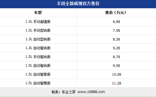 11月6日,一汽豐田全新威馳正式上市。此次新車共推出了八款車型供選擇。相比上一代車型,全新威馳不僅采用了新的設計風格,全新威馳搭載1.3L及1.5L兩款動力基礎上共計推出8款車型。新車售價區間為6.98-11.28萬元,具體售價請見下表: